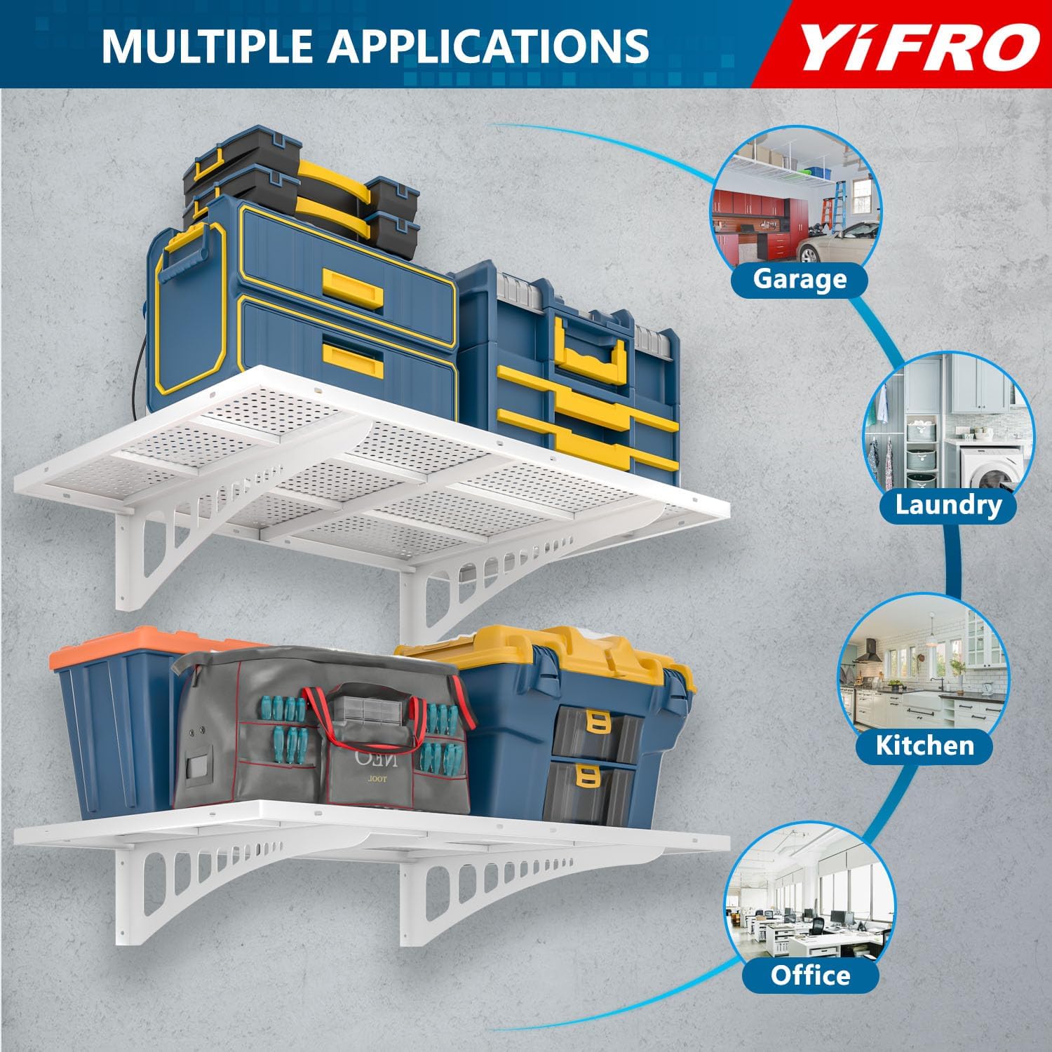 • ADJUSTABLE SPACING: YIFRO garage wall shelves is suitable for any wood post spacing, including standard 16'/18'/24'/32' spacing for installation.
