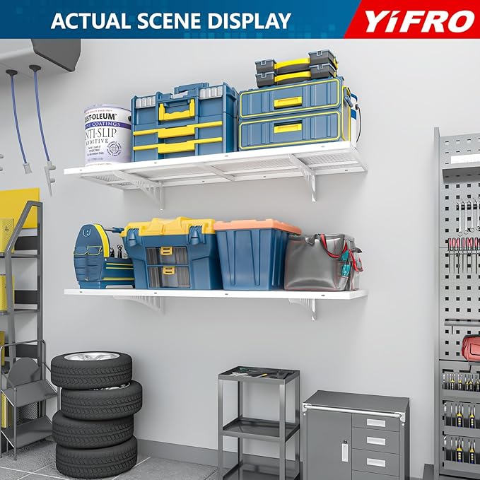 • HEAVY DUTY CONSTRUCTION: YIFRO garage wall shelving takes its cues from architectural frame construction, with a 1.5x4 ft individual bracket load capacity of 250 lbs. and a total of 1000 lbs. for 4 shelves, which makes it easy to store most of the items in your garage.