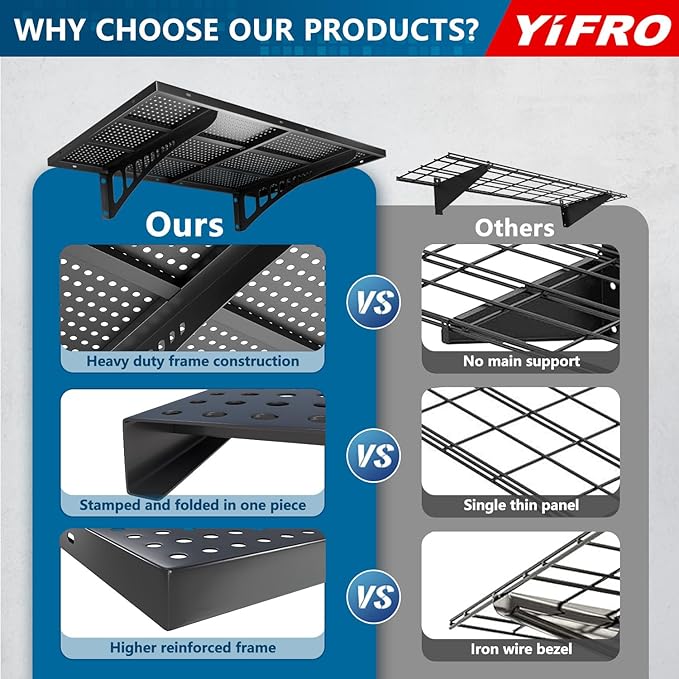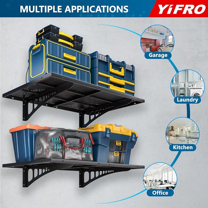 • HEAVY DUTY CONSTRUCTION: YIFRO garage wall shelving takes its cues from architectural frame construction, with a 2x3 ft individual bracket load capacity of 250 lbs. and a total of 500 lbs. for 2 shelves, which makes it easy to store most of the items in your garage.