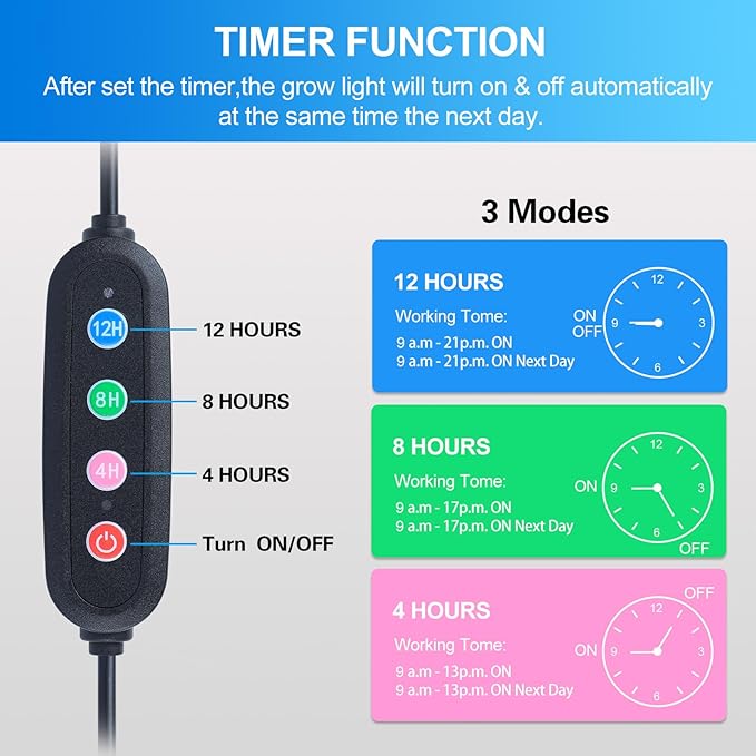 • Timer for Auto On/Off Plant Grow Light---4/8/12H Timer Grow Lights for Indoor Plants. Auto On/Off Every Day Just as You Need.