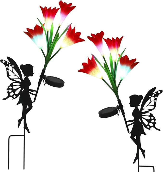 • 2 Pack Unique Solar Outdoor Lights: The solar lights outdoor waterproof exquisitely designed with the cute standing metal fairy statue holds up the imitate real lily flowers. Adjustable flower stems and leaves make you freely design the pose and angle of this solar fairy garden decor for outside as you like, creating a romantic atmosphere for your garden. The solar pathway lights can transform your garden into a dazzling wonderland at night