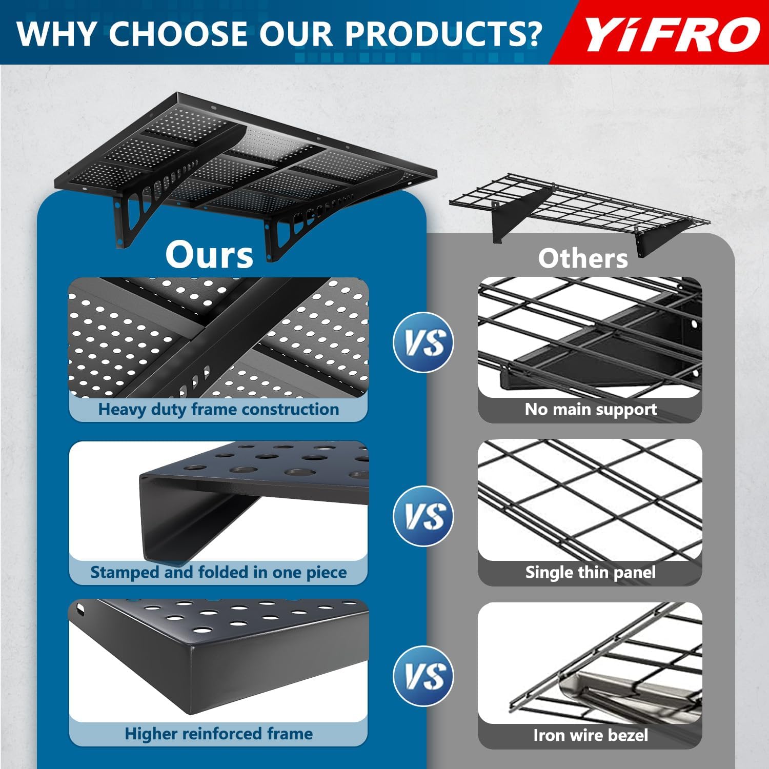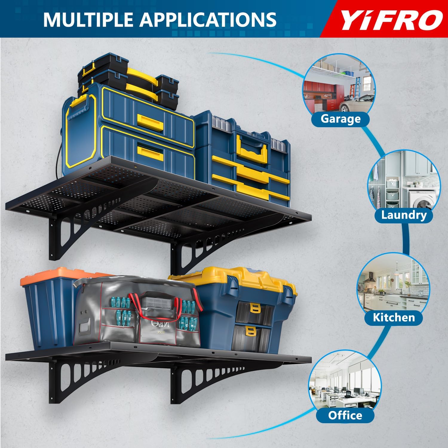 • HEAVY DUTY CONSTRUCTION: YIFRO garage wall shelving takes its cues from architectural frame construction, with a 2x3 ft individual bracket load capacity of 250 lbs. and a total of 1000 lbs. for 4 shelves, which makes it easy to store most of the items in your garage.