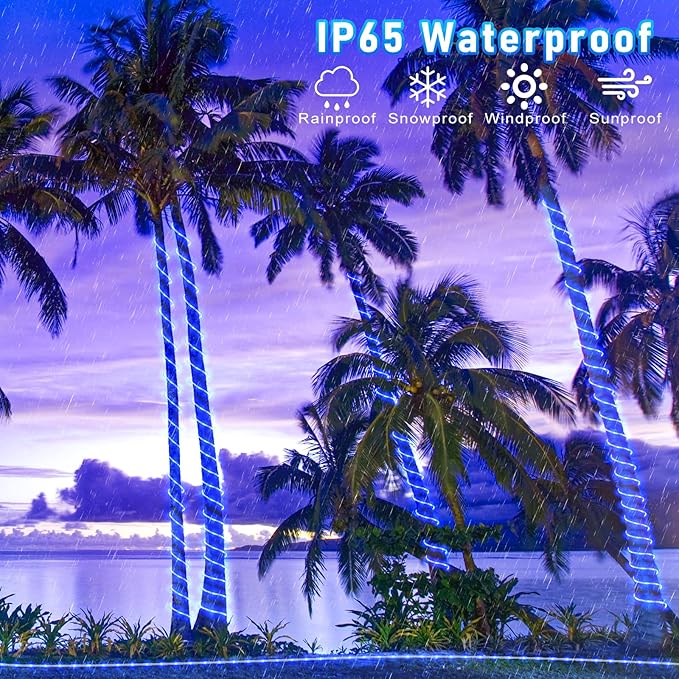 • 【Waterproof Outdoor String Lights】- IP65 Waterproof design, they are suitable for all weather use, remaining bright and sparkling even during strong rain and windy days. The outdoor rope lights is ideal for year-round outdoor decor and can illuminate gazebos, canopy, corridors, gardens, and patios. But please note the plug is not waterproof.