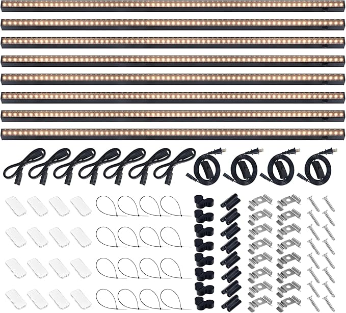 • What You Get: 8 x Barrina T5 Grow Lights, 4 x Power Cords with ON/OFF Switch, 7 x Connecting Cords (20''), 8 x Small Connectors, 16 x Installation Clips, 16 x Magnetic Bars with Double-Sided Tape, 24 x Cable Ties, 8 x Dustproof Cap