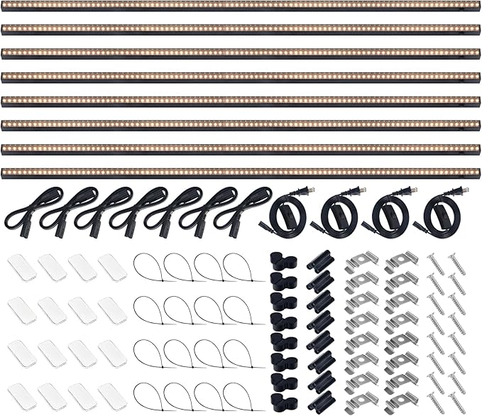 • What You Get: 8 x Barrina T5 Grow Lights, 4 x Power Cords with ON/OFF Switch, 7 x Connecting Cords (47.2''), 8 x Small Connectors, 16 x Installation Clips, 16 x Magnetic Bars with Double-Sided Tape, 24 x Cable Ties, 8 x Dustproof Cap