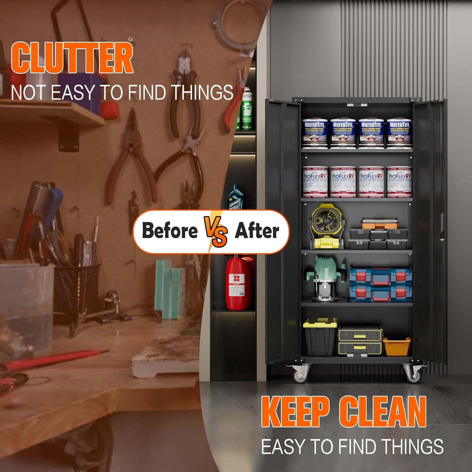 72" H Metal Storage Cabinet with 2 Doors and 4 Adjustable Shelves, Garage Storage Cabinet with Wheels for Garage Home, Required-Assembly,Black