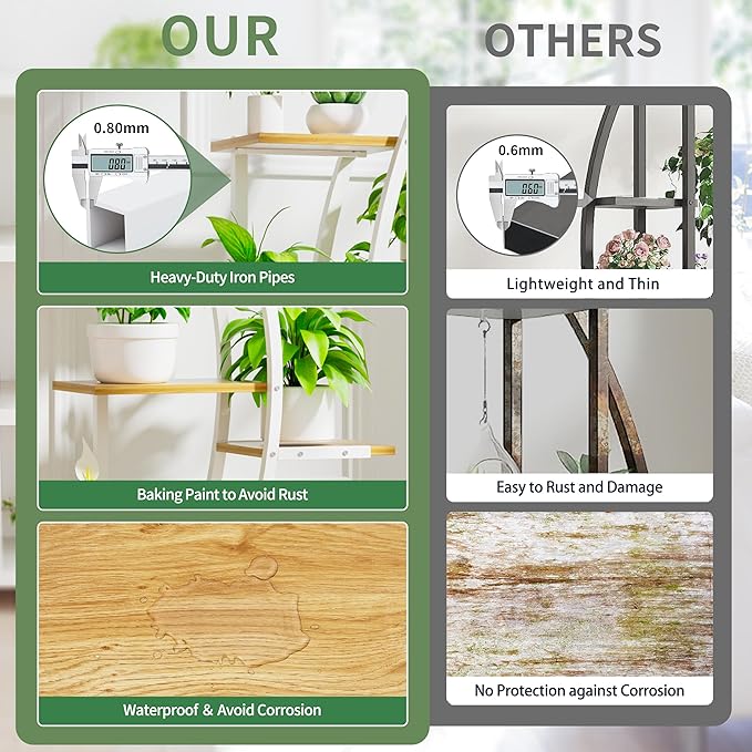 • 【High-Quality Material & Sturdiness】This plant holder is made with a sturdy 0.8mm thick iron pipe frame, with high-quality 15mm thick particleboard shelves, ensuring both durability and stability. The iron pipes are coated with special paint to prevent rust, while the shelves are treated with a water-resistant coating, allowing you to easily wipe away any water without damage.