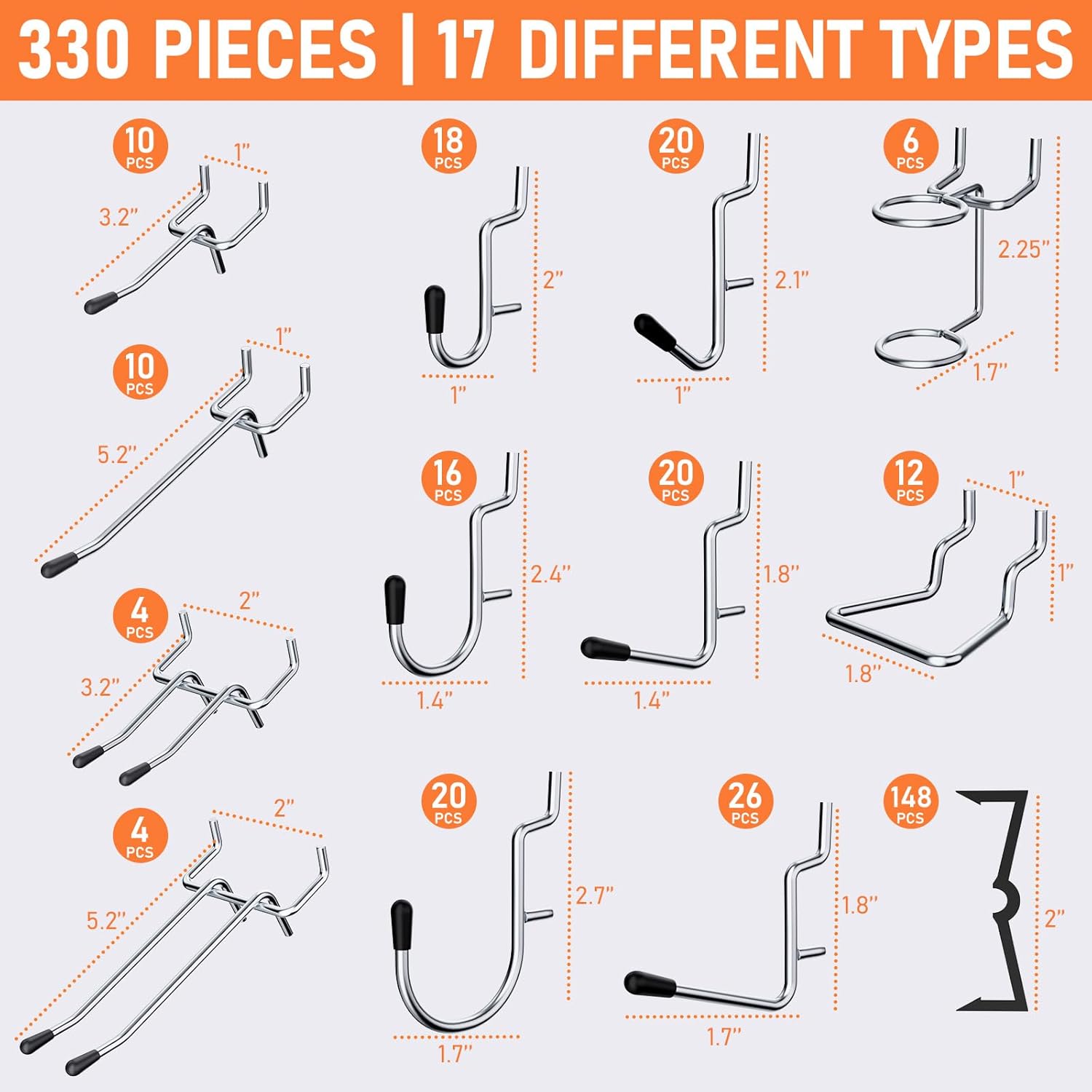 • VALUABLE PACKAGE: The upgrade pegboard hooks set comes with 330 pieces peg board accessories in 17 different types, including: 9 x pegboard bins, 3 x pegboard cups, and various hooks like curved hooks, angled hooks, straight hooks, pliers holder, ring tool holder, multi tool rack and peg locks for fix hooks