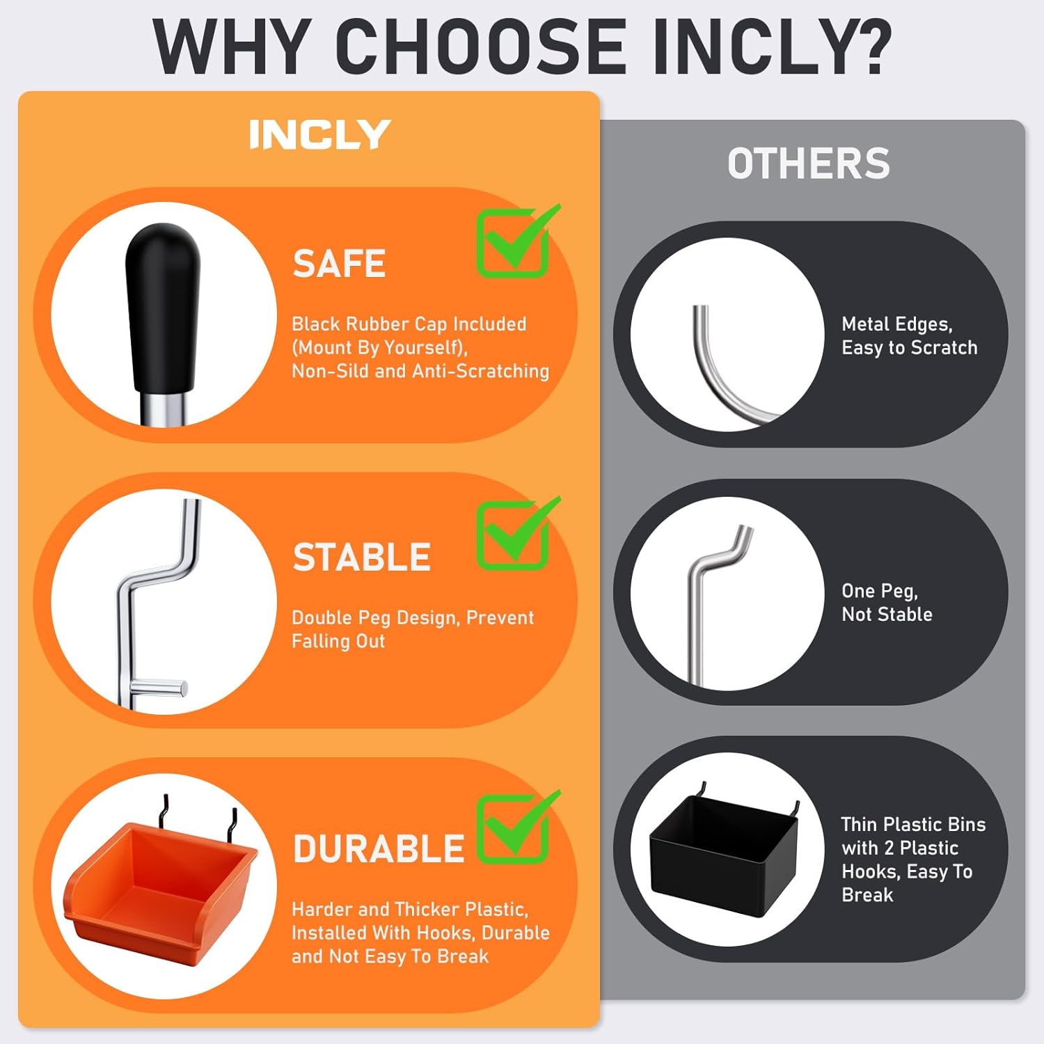 • WIDE APPLICATION: The INCLY pegboard tool organizer is ideal for storage solutions on a wide range of garage, workbench, craft room, workshop, kitchen, shop, tool sheds, factory, or warehouse. This pegboard kit helps you to well organize your various stuff