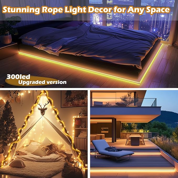 • ✨【Upgraded Solar Rope Lights】 98 feet 300 LEDs, features a built-in 1200mAh high-capacity battery, offers extended illumination for larger spaces. Its durable design ensures long-lasting performance.