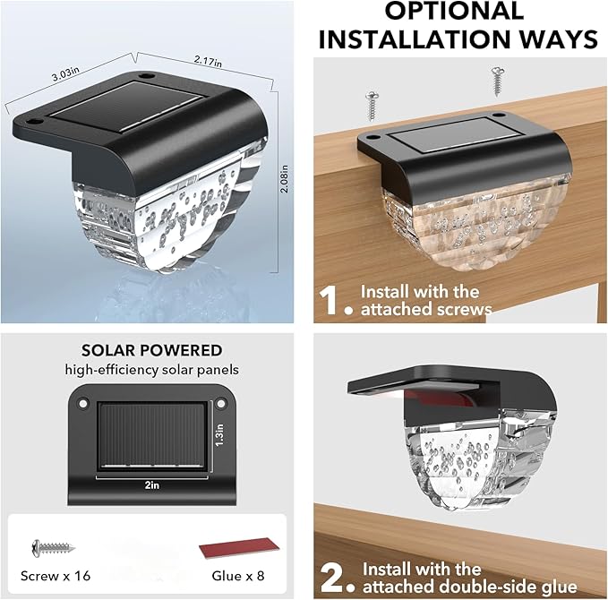 • 【Easy Installation】No wires required, Comes with the screws and glues, two installation methods for you to choose. You can use the screws or glues install(Will not leave a hole on your deck) , place it vertically or lay down flat along any edge of the stair, deck, fence, steps.