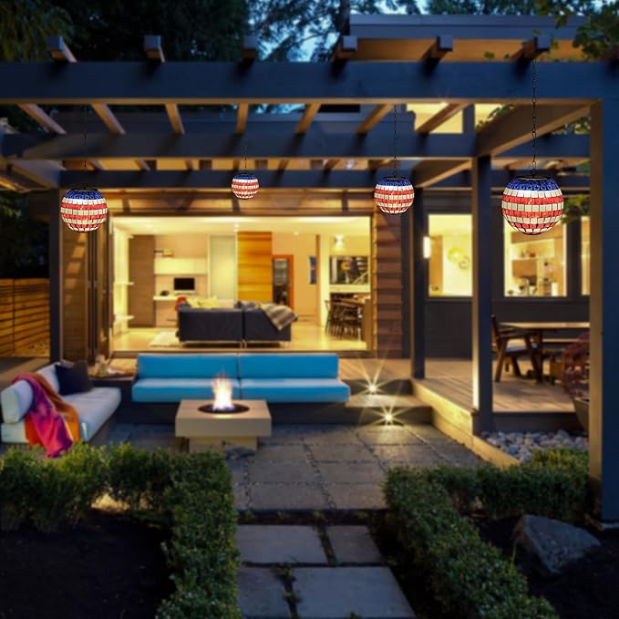 • 【Patriotic Mosaic Design】Each solar hanging lantern is meticulously crafted with high-quality mosaic glass gazing balls, featuring American flag patterns that cast beautiful, warm projections. The sturdy metal chain ensures durability, making these lanterns perfect for enhancing the ambiance of any space, from gardens to patios.