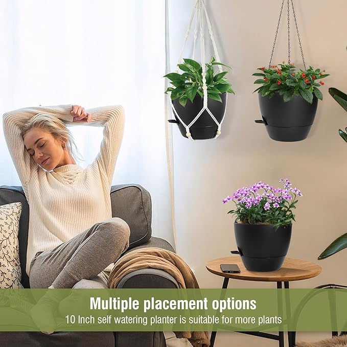 • 【Self-Watering Hanging Planter with Removable Tray】This hanging flower pot comes with a detachable bottom tray that acts as a water reservoir, holding a good amount of water. When your plant needs water, it’s absorbed through cotton wicks from the reservoir to the soil, reducing how often you need to water