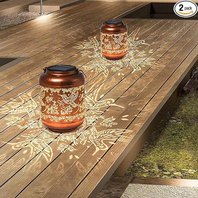 • 【Hummingbird Garden Decoration】The solar outdoor lantern is inspired by animal elements in nature. It projects bright hummingbird patterns in the dark, creating a gorgeous and warm atmosphere and bringing vitality and fun to your garden. It adopts a gold-copper color and hollowed-out metal finish, presenting a retro look.
