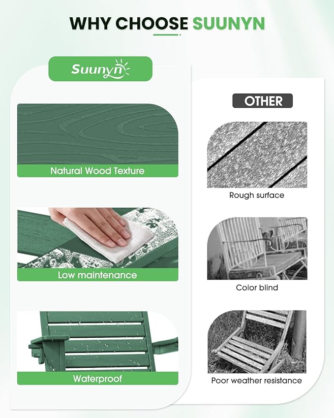• Weather-Resistant: Made of high-quality HDPE material with wooden texture, SUUNYN sturdy adirondack chair offers excellent weather resistance, resisting fading, splitting, cracking, chipping, peeling, and rotting in harsh conditions. Plus, its easy-to-clean surface and low maintenance