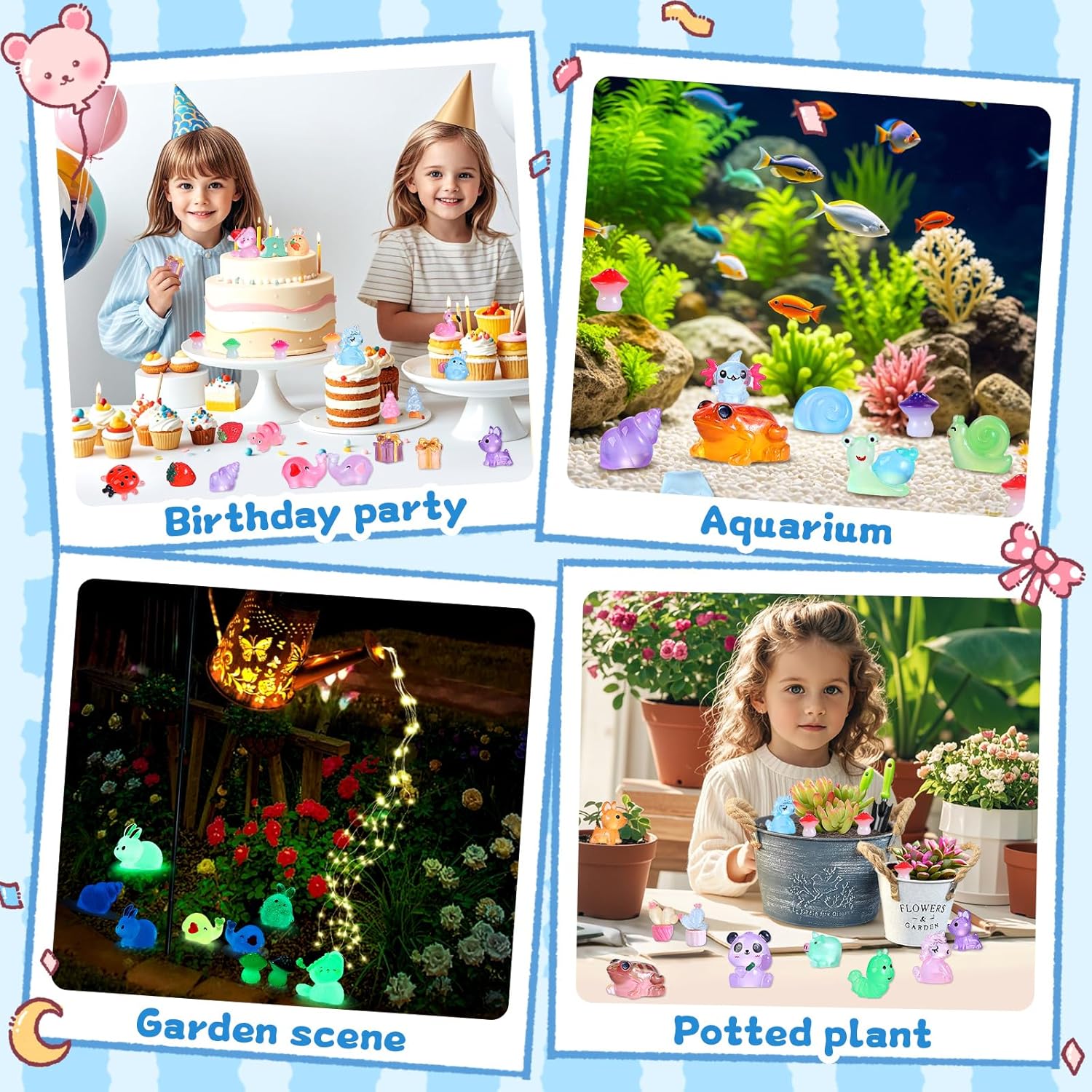 • Package Content:You will get 130pcs luminous tiny resin animals, including mini ducks, mini frogs, mini dinosaur figures, panda,chicken,lizards, bunnies, unicorns, flamingos, piglets, puppies, cat,snails, turtles, etc. Enough quantity will meet your diverse needs.