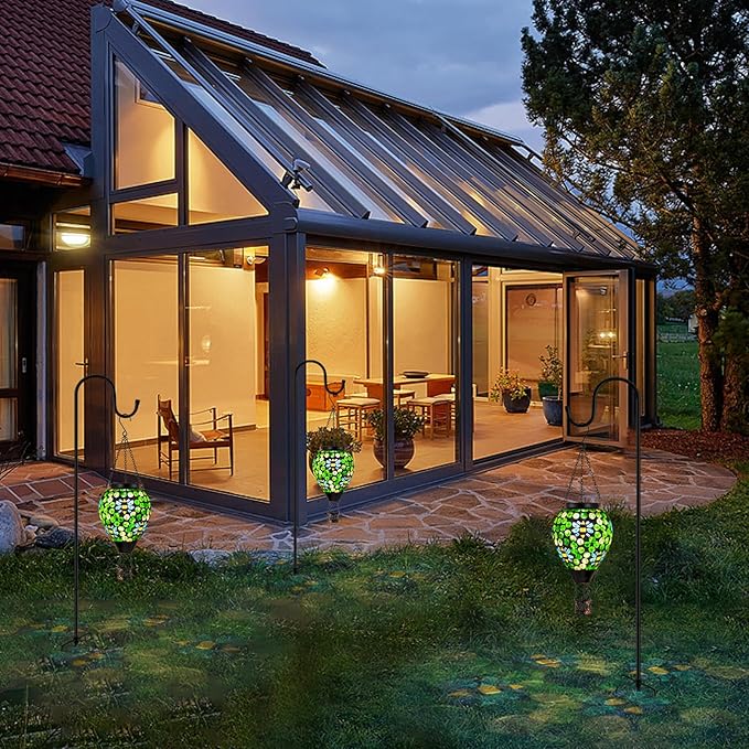 • Solar Lanterns: Outdoor solar lanterns absorb sunlight during the day and are automatically lit at night, providing 6-8 hours of illumination. The soft warm light of the hanging solar lantern creates a romantic and peaceful atmosphere for the outdoor space.