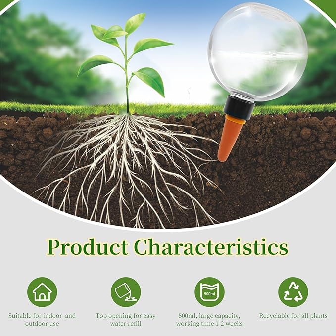• 【No effort and no time】:practical and efficient solutions for busy plant lovers;You don't need to remember when to water your plants, just check the water balloons 1-2 times a week; The large capacity of 17.5 oz / 500 ml saves you the time and effort of frequent refills.