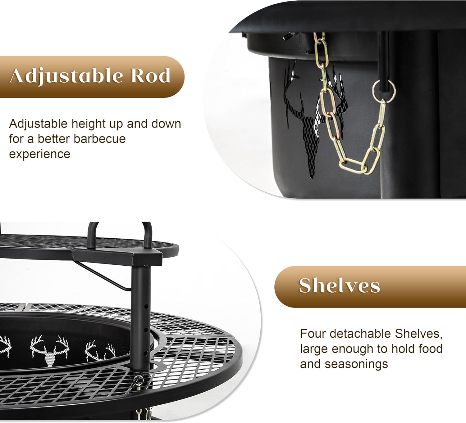 • Safe and Reliable: With built-in handles, the outdoor fire pit with grill can be easily rotated 360 degrees and adjusted up and down in height. And the stable round support structure makes wood burning fire pit safer to use. It provides a safe experience