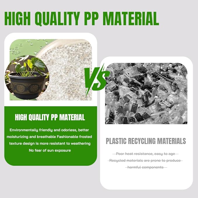 • STURDY PLASTIC & LIGHTWEIGHT : Our flower pots are made from sturdy PP plastic, which make sure long-lasting, lightweight and to provide a suitable growth environment for your plants.