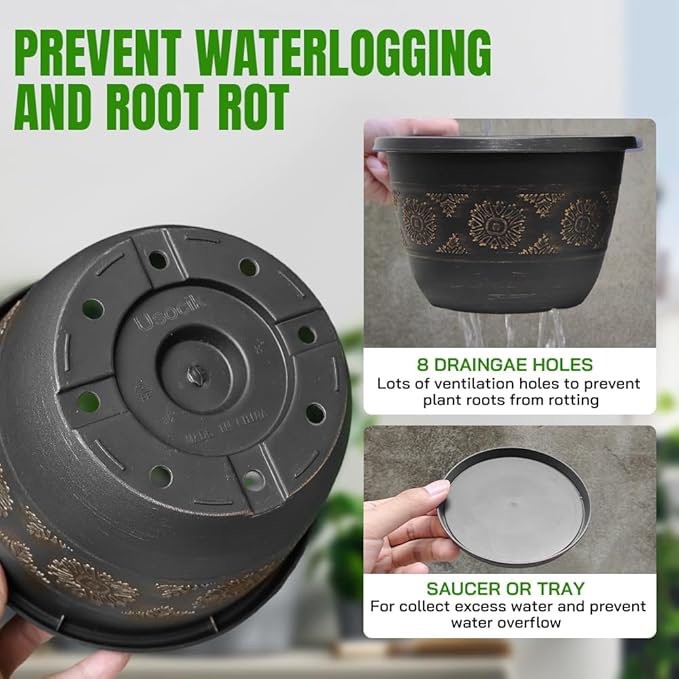 • DRAINAGE HOLE WITH SAUCER – Each garden pot has drainage holes and a saucer. The holes of these plant pots helps protect plants from excess watering. The saucer help to collect excess water and prevent water flowing, keeping the floor dry and clean.