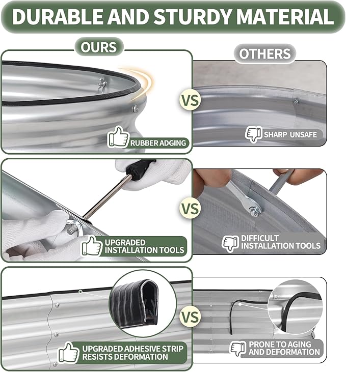 • 【High-Quality Materials & Durable】 Made from 0.5mm galvanized metal panels with double-layer anti-corrosion galvanization, this outdoor raised garden bed features a robust oval-shaped design for added strength and durability. Resistant to rust and corrosion, it provides a long-lasting gardening solution that can be reused for many years, ensuring a sustainable and reliable space for your plants to thrive