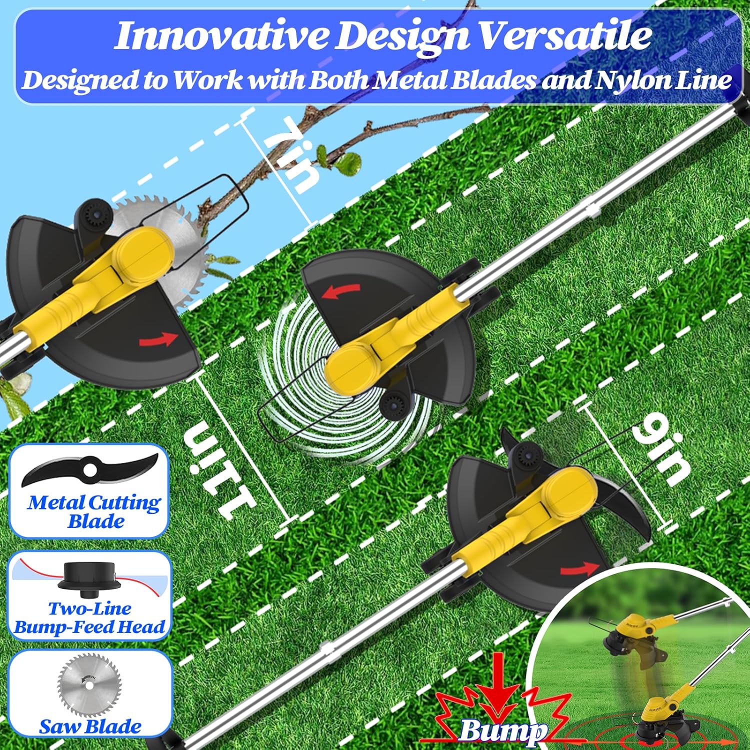 • 【All-In-One Compatibility: Metal Blade, Dual-Line Bump-Feed】 0.095″ dual-line head (11″ width) cuts fine grass with ease. 9″ metal blade effortlessly handles overgrown vegetation.