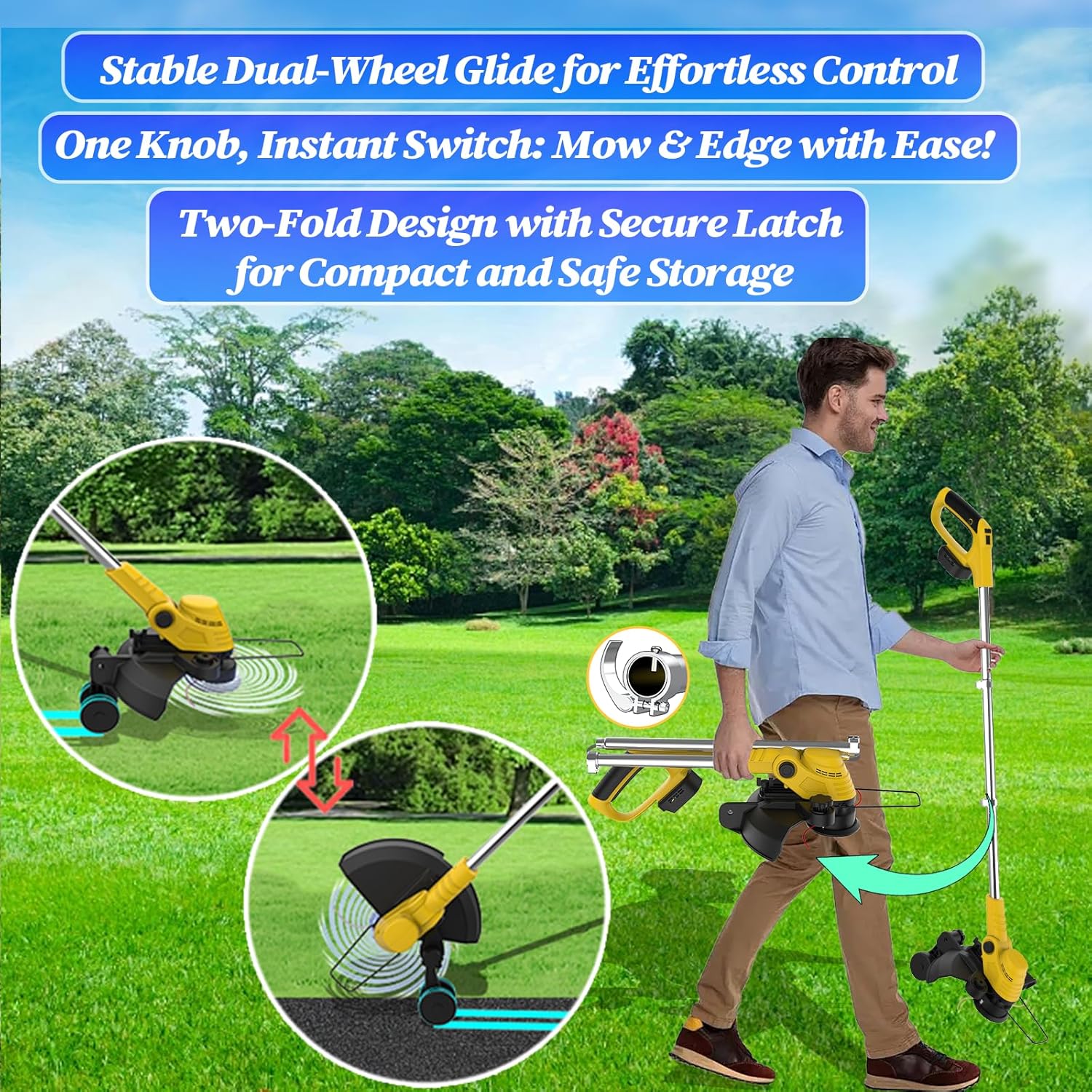 • 【Ergonomic Wheel-Edger & Mini Mower】 Effortlessly switch between edging and mowing by attaching the wheels. Hand-tightened bolt allows a tool-free mode change. Designed for swift assembly—no screwdriver required.