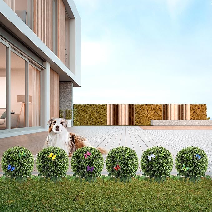 • 【90-Second Setup & Versatile Styling】 Pre-assembled structure with bendable vines and embedded ground spike allows instant installation in soil, pots, or rocky terrain. Rotate 360° to showcase fake butterfly ornaments from every angle – Our evergreen faux boxwood balls is perfect for photo-ready porch décor or events