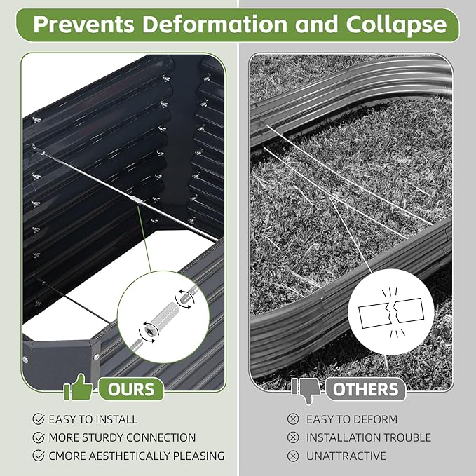 • 【 Superior Durability 】Made of 0.7mm thick zinc-coated steel with spray coating, our raised garden bed resists rust, corrosion, and deformation for 5x longer lifespan than thin competitors. Dual-folded edges ensure galvanized garden bed structural stability even in harsh weather.