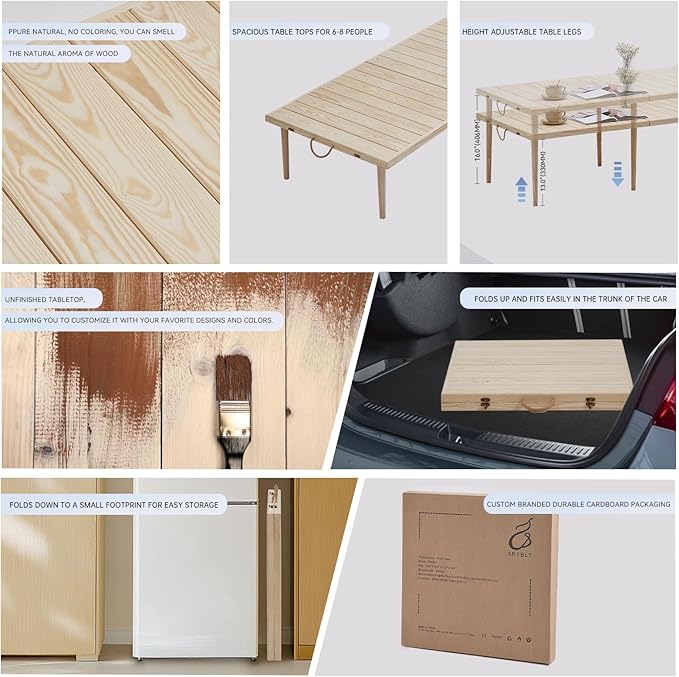 • HANDCRAFTED FROM NATURAL PINEWOOD: Our Wooden Folding Picnic Table is expertly handcrafted from natural pinewood, with each piece of wood carefully selected as a gift from nature. The removable table legs are made from durable rubberwood, providing a sturdy base, and the unfinished surface brings a touch of bohemian charm while ensuring long-lasting durability.