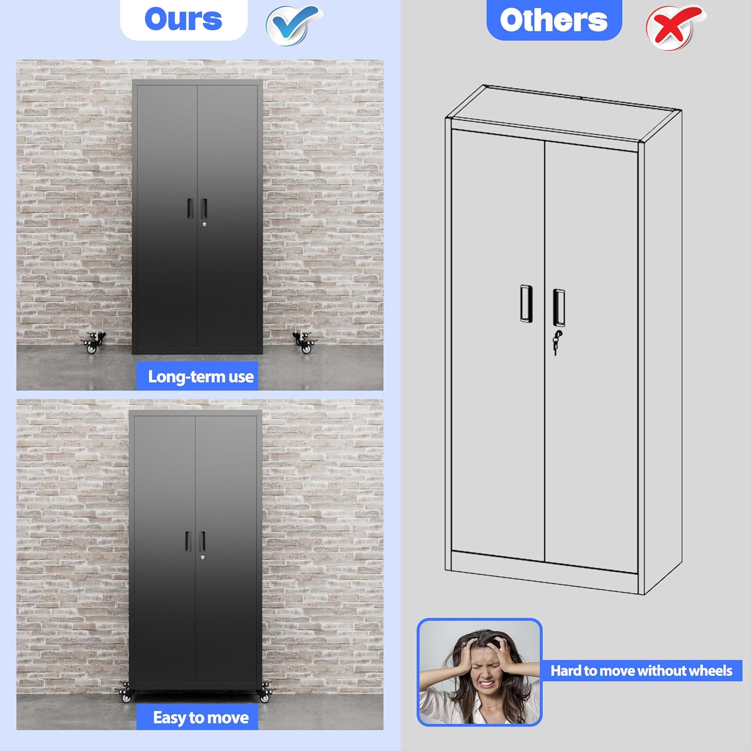 • Detachable Swivel Wheels with Lock: Metal storage cabinet with wheels has 4 lockable wheels,you can move them around as needed and The wheels are lockable and detachable and you can fix the cabinet where you want to place