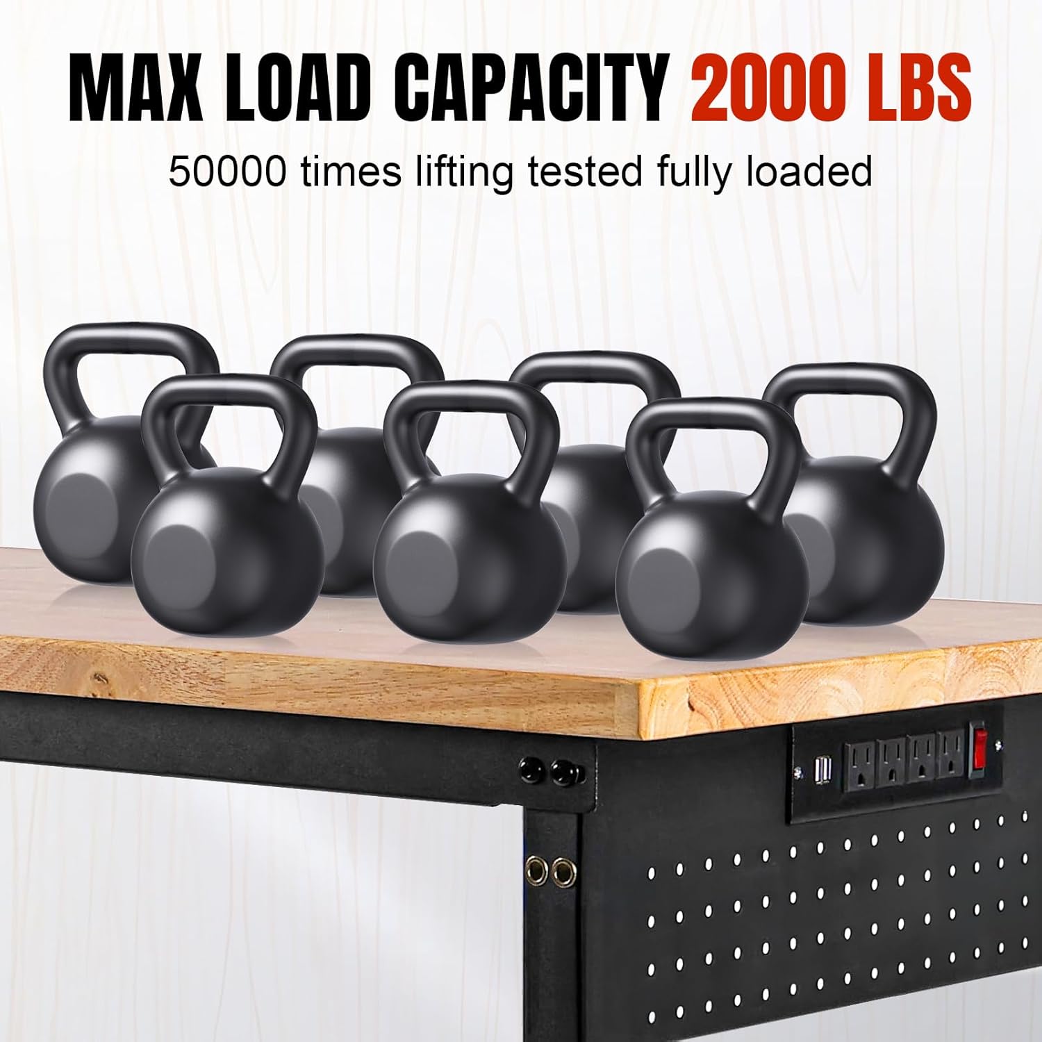 • SOLID RUBBER WOOD AND REINFORCEMENT BARS: solid rubber wood tabletop. With an upgraded metal frame, this heavy-duty workbench has a weight capacity of over 2,000 lbs. Extra support rods make the workbench even more stable.