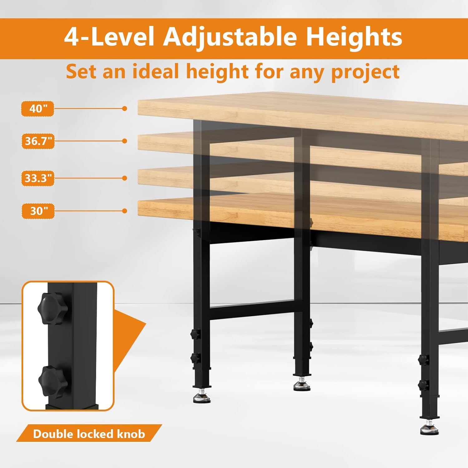60" Work Bench, Adjustable Height Workbench with Rubber Pad, Heavy-Duty Work Table with Power Outlets, 2000 LBS Capacity Workstation for Garage, Workshop, Office, Home