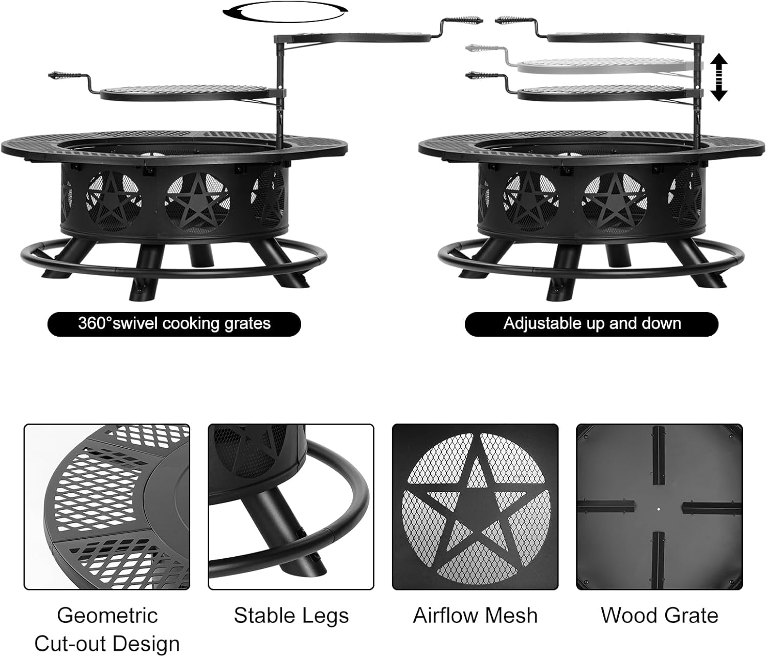 • [Beautiful & Humanized Design]OutVue fire pit table comes with 2 height-adjustable and 360° swivel grills which disassemble freely. You can barbecue, keep food warm or put pan to cook on them. The side of wood-burning fire pit is created with classic stars cut-out design which catches firelight for creating fun shadows. The drilled design promotes airflow and keeps the fire strong. All sophisticated designs of the fire pits for outside are dedicated to the warmth and comfort for you.