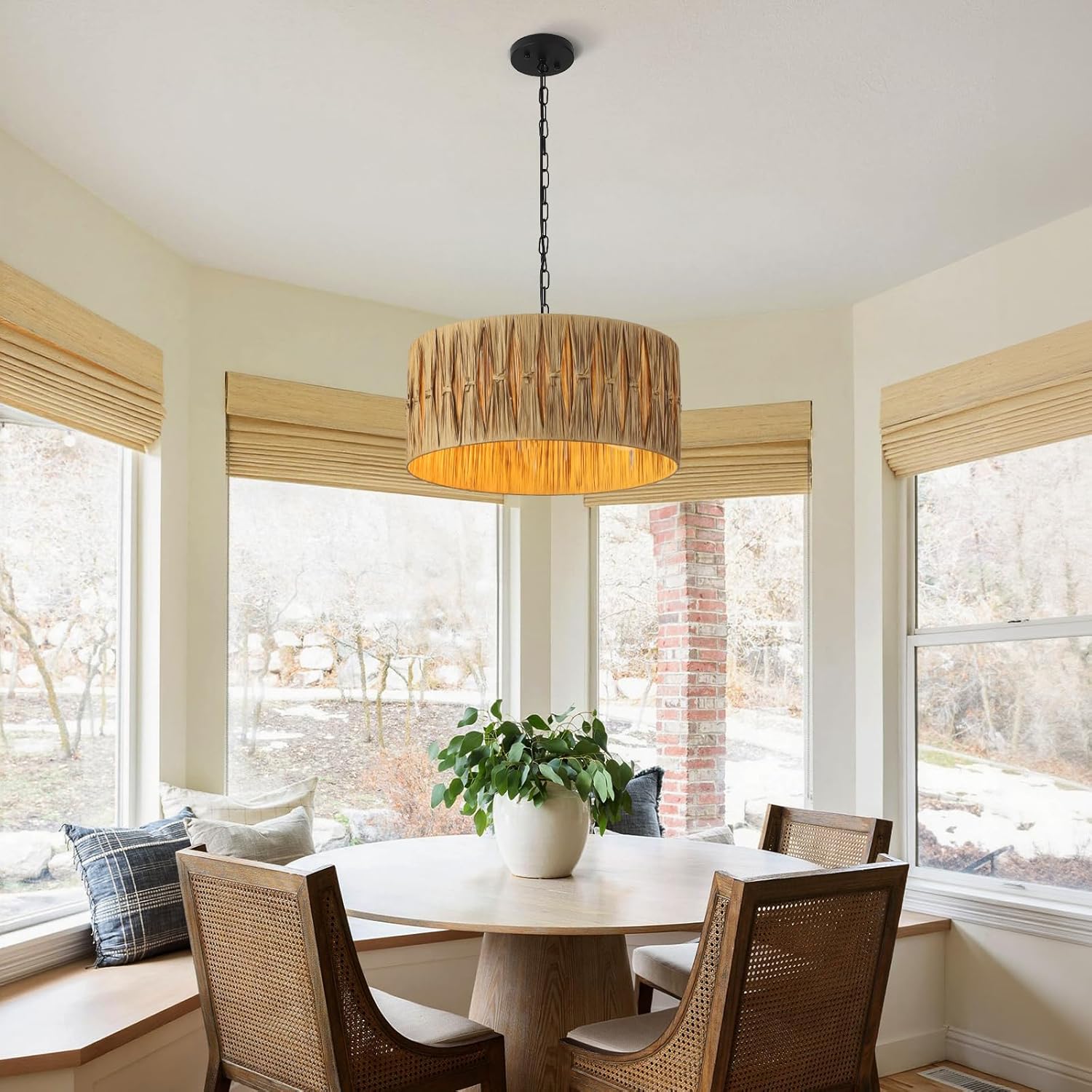 • Unique Boho Chandelier: Our dining room chandelier is crafted from handwoven raffia. With a distinctive design that merges artistic flair and modern sophistication, each piece transcends functional lighting to become a captivating decorative centerpiece