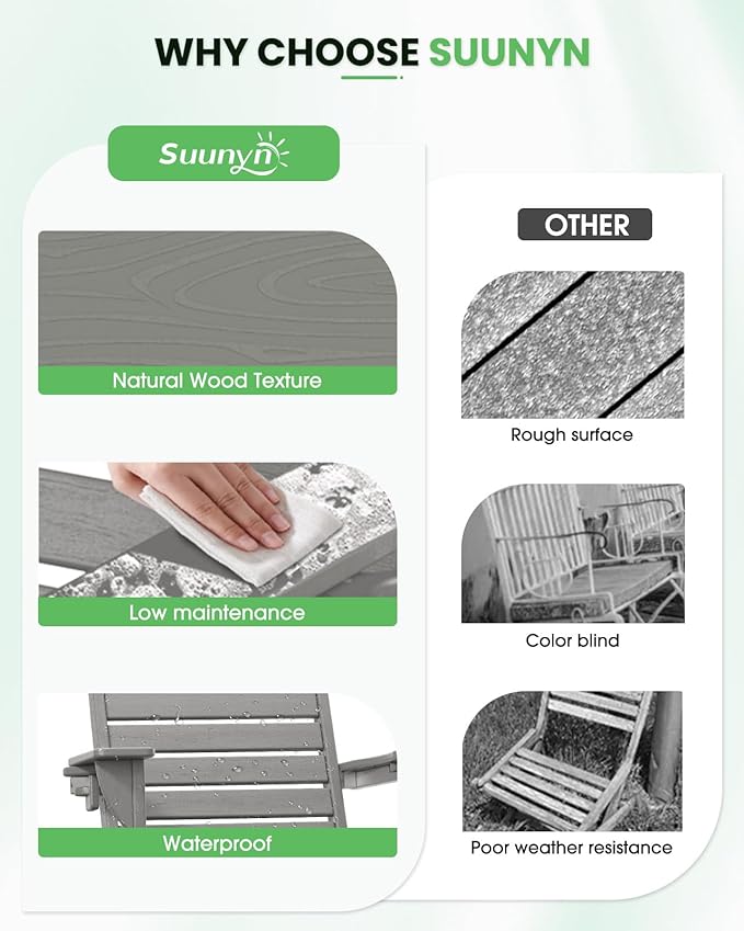 • Weather-Resistant: Made of high-quality HDPE material with wooden texture, SUUNYN sturdy adirondack chair offers excellent weather resistance, resisting fading, splitting, cracking, chipping, peeling, and rotting in harsh conditions. Plus, its easy-to-clean surface and low maintenance