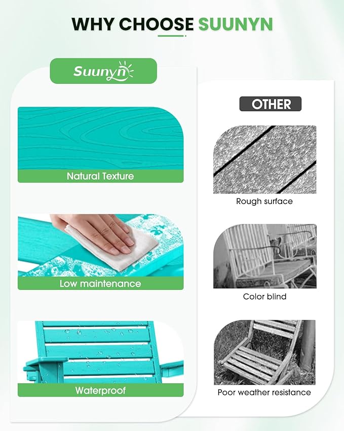 • Weather-Resistant: Made of high-quality HDPE material with wooden texture, SUUNYN sturdy adirondack chair offers excellent weather resistance, resisting fading, splitting, cracking, chipping, peeling, and rotting in harsh conditions. Plus, its easy-to-clean surface and low maintenance