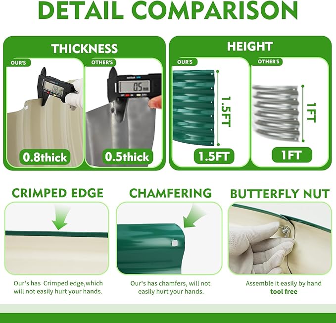 • Sleek Design: The Green color and clean lines of the galvanized raised bed add an aesthetic appeal to your garden or outdoor area. It blends well with the surroundings, adding a touch of elegance to your plantings