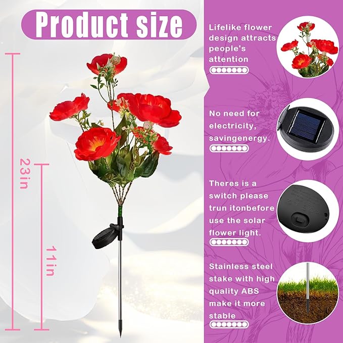 • Bring your garden to life with QINGYA Newest Version Vivid Outdoor Solar Garden Decor Lights! These decorative LED flowers are perfect for adding a touch of color and elegance to any outdoor space. Whether you're entertaining guests, enjoying a quiet evening under the stars, or just relaxing with a good book, these elegance lights provide the perfect ambiance.