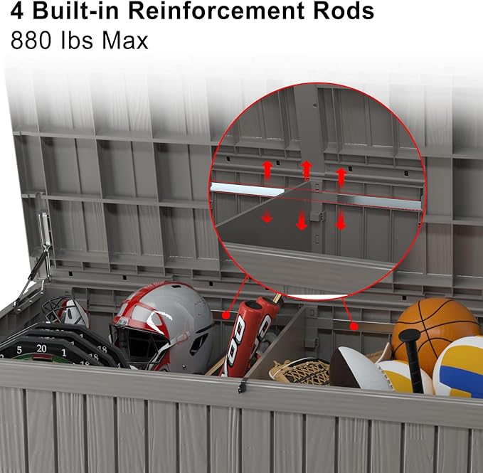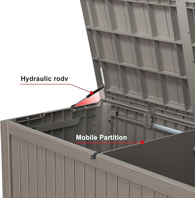 • Hydraulic Support for Easy Lid Opening:Equipped with hydraulic support, this deck box lid opens smoothly and stays open, providing easy access to your stored items. No need to struggle with heavy lids anymore.