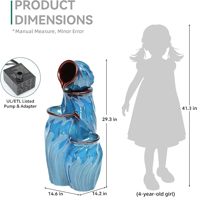 • EXQUISITE ARTISTIC DESIGN: This ceramic pot fountain is a magnificent 4-tier outdoor fountain with charming handcrafted kiln-fired reactive glaze and embossed wave patterns. Standing at 14.57"L X 14.17"W X 29.33"H, it creates a stunning focal point, bringing natural beauty and artistic elegance to your garden, patio, or yard.