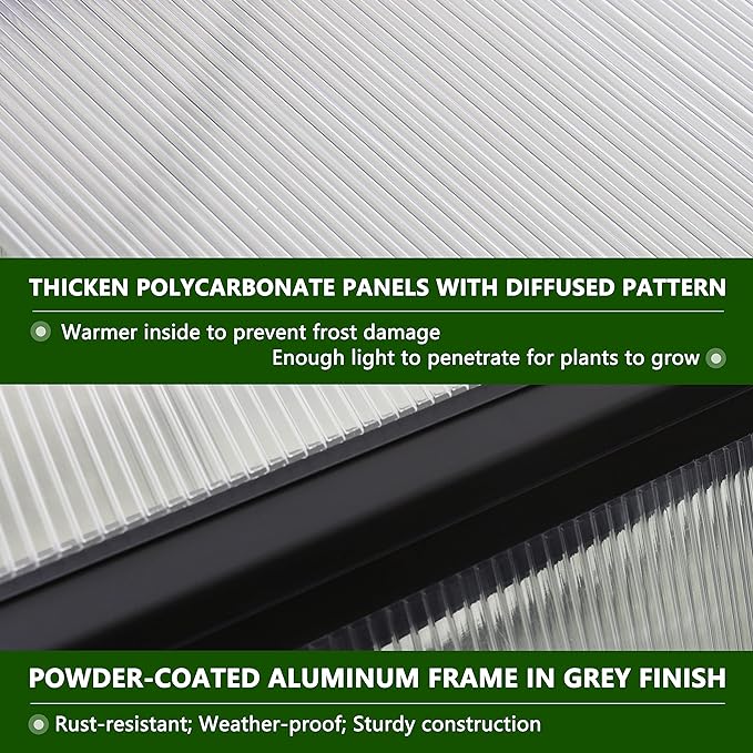 • Heavy Duty Greenhouse for Outdoor: The frame of our greenhouse is made of high quality, corrosion and weather resistant gray powder coated thickened aluminum which is rust resistant and stable in all climates. Thick polycarbonate panels with a diffusion pattern provide extra warmth for the plants while preventing frost, making the plants absorb more sunlight and thrive