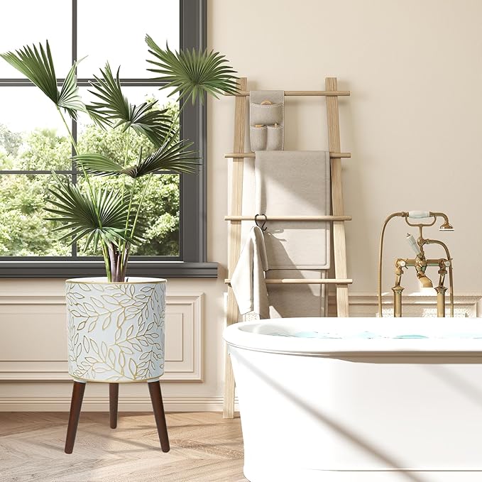 12inch Plant Pots with Wood Planter Holder Indoor Flower Pot with Gold Floral Embossed Modern Planters with Drainage Holes for Living Room, Office, Garden or Balcony