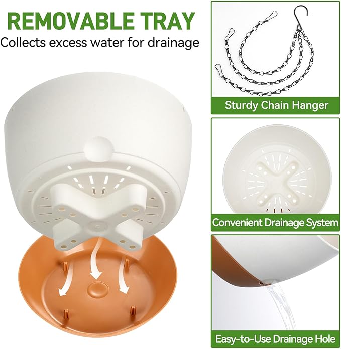 • 【Watering Made Easy】 Our hanging plant pots feature a built-in drainage system and a water reservoir tray that stores enough water for 7-14 days, preventing root rot and ensuring proper hydration. Ideal for busy schedules or travel, offering hassle-free plant care.