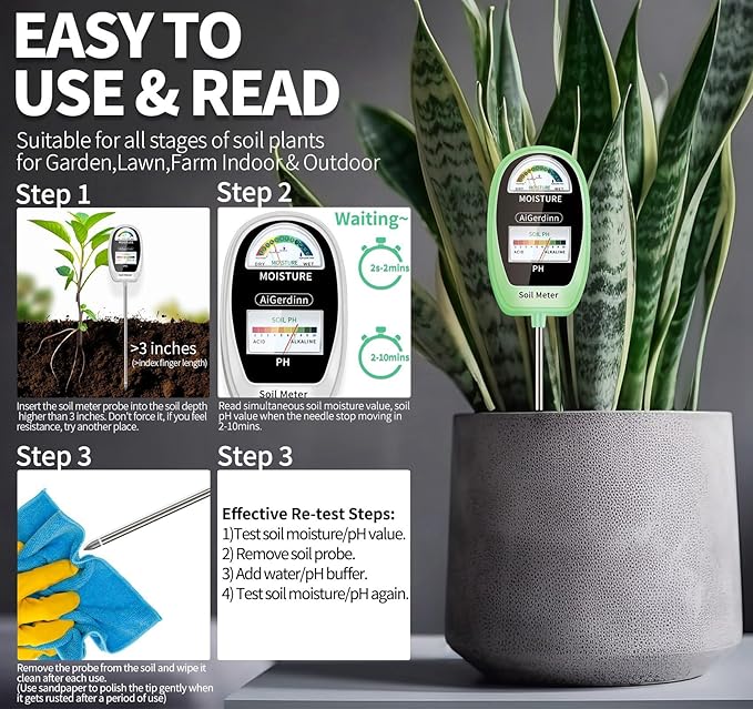 • 2-in-1 Soil Moisture Meter & Soil pH Meter: Designed for beginners, upgraded testing structure, a creative Dual-Dial design, can meet your different needs. Simply unbox and use. This soil meter takes the guesswork out of taking care of your plants and elevates your planting experience to the next level. Helps you to plant lush and healthy house plants.