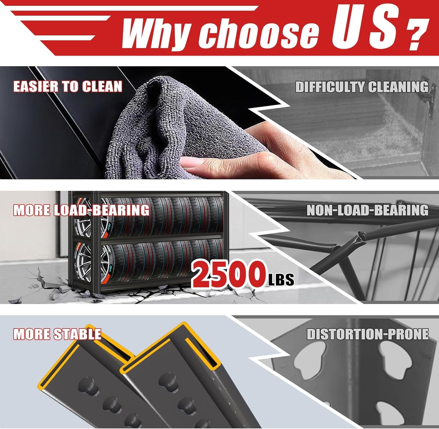 • 【Heavy-Duty 2500 lb Capacity】 Constructed with industrial-grade steel and reinforced crossbars, this 5-tier shelving unit supports up to 500 lbs per shelf (even distribution), ideal for storing heavy tools, automotive parts, or warehouse inventory without bending or wobbling.