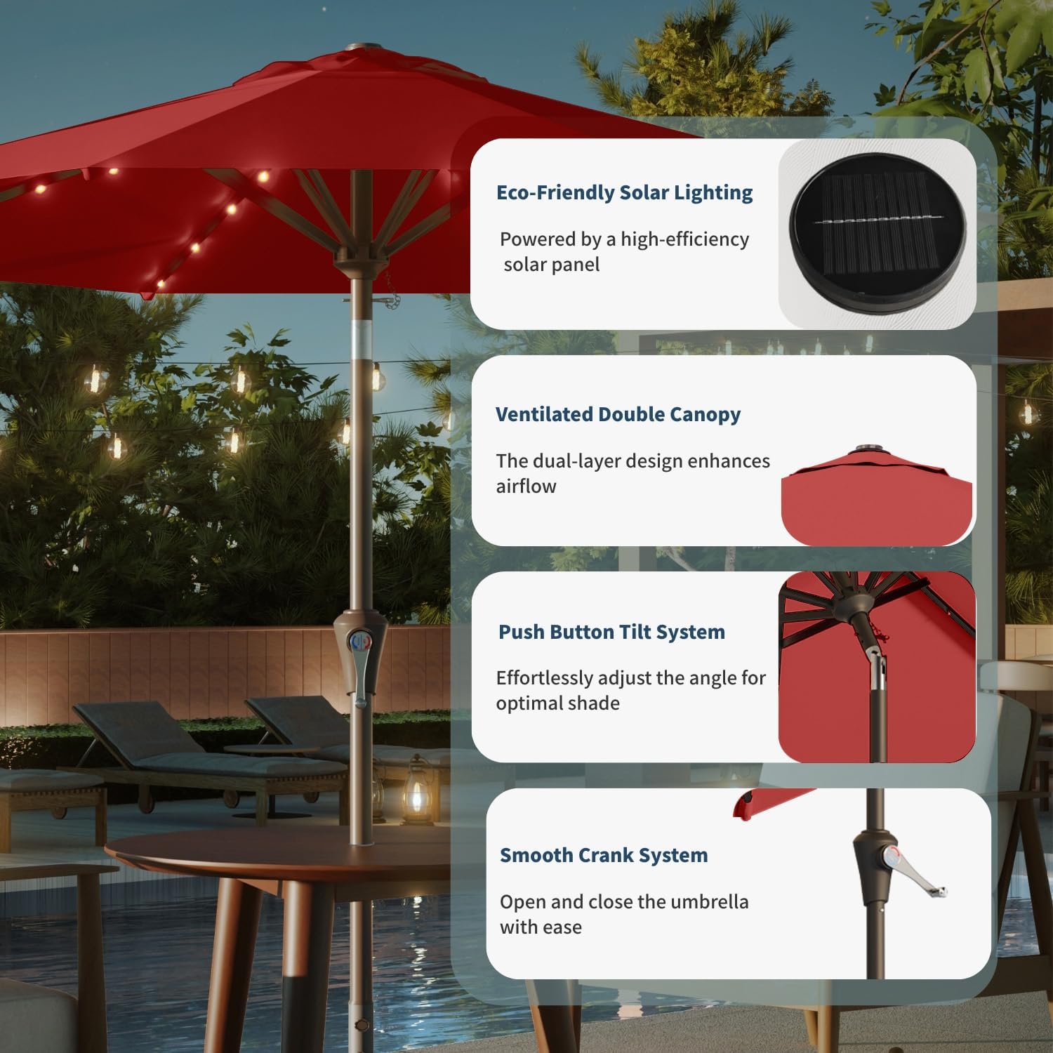 • Convenient Tilt and Crank Mechanism: Easily adjust the umbrella's angle with the push-button tilt feature to block the sun at different times of the day. The user-friendly crank handle allows for smooth opening and closing.