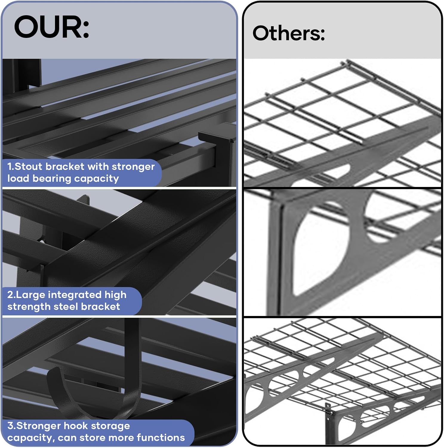 • Multiple storage functions: each garage wall mount shelf provides six hooks, which can maximize the storage function of the shelf to meet a variety of storage needs, while keeping the environment neat and tidy