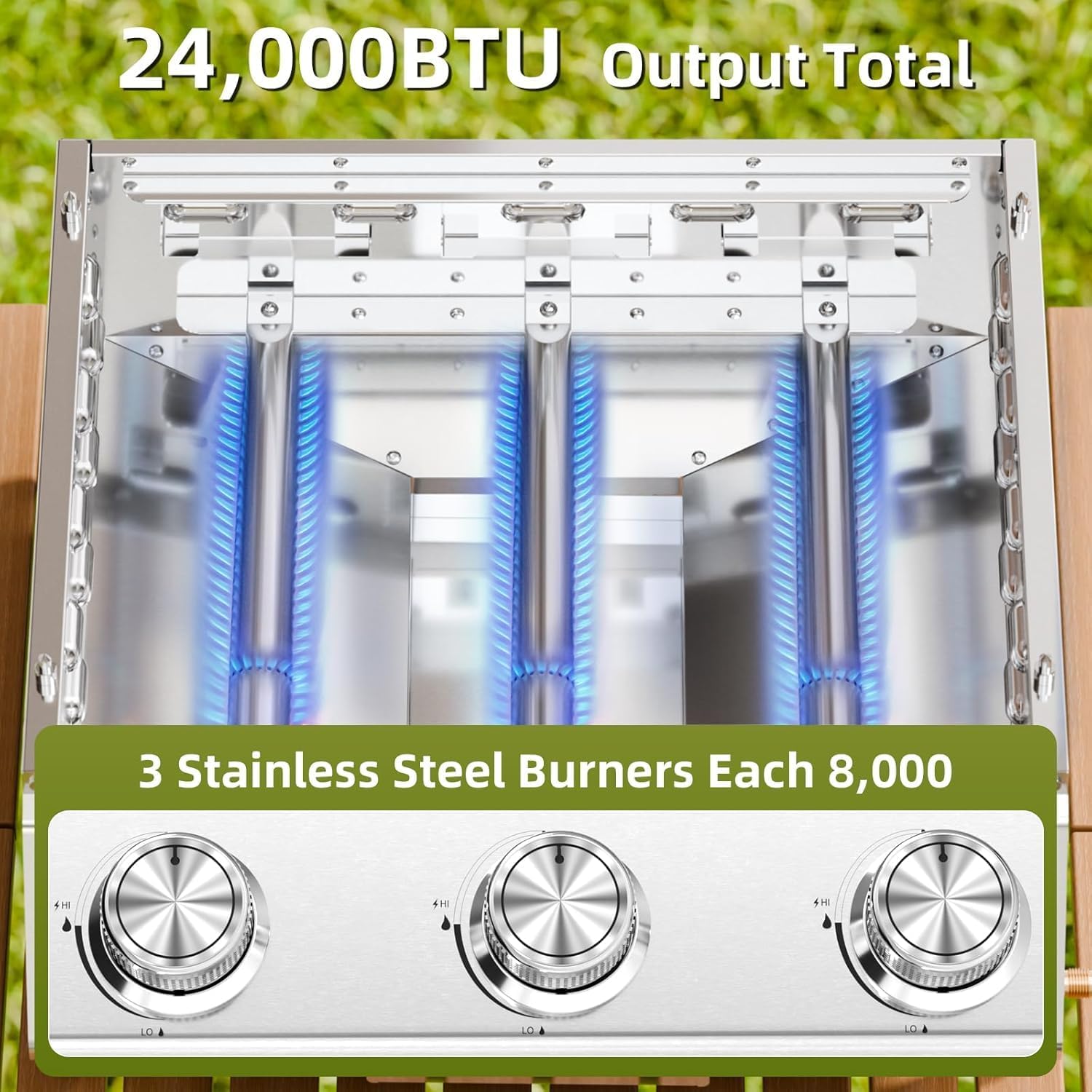 • Precise Heat Control: Outdoor propane grill is designed with 3 independent 8000 BTU stainless steel burners deliver precise heat control.Twist-start ignition and independent control knobs allow you to create custom heat zones for various foods